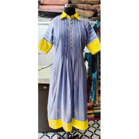 This Indo Western Kurta Dress blends casual comfort with vibrant charm. Designed with soft blue vertical stripes and contrasted by bold yellow lace accents on the sleeves, hemline, and collar, it’s a refreshing fusion of traditional and contemporary styles. Ideal for semi-formal outings, casual gatherings, or day functions, this dress keeps you effortlessly stylish.