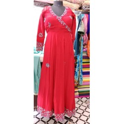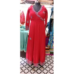 Step into elegance with this timeless Anarkali Lehenga in a rich red hue, embellished with delicate blue floral embroidery. Featuring a wrap-style bodice, flared silhouette, and detailed sleeve and hem work, this ensemble brings regal charm to festive and traditional occasions. Perfect for weddings, mehendi functions, or cultural events, it captures grace with every swirl.